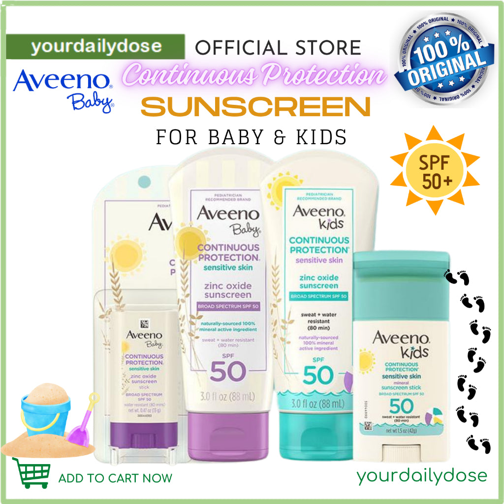 Aveeno Kids Continuous Protection Sensitive Skin Sunscreen Lotion with Broad Spectrum SPF 50 is formulated with friendly ingredients for kids' delicate skin and contains skin-soothing oat and a naturally-sourced 100% zinc oxide active ingredient. The mineral sunscreen for kids provides superior broad spectrum protection from UVA/UVB rays and is both sweat- and water-resistant for 80 minutes. From a pediatrician-recommended brand, this kids hypoallergenic sunscreen lotion is designed for children's sensitive skinLOTION and applies easily to lock in moisture without stinging. The tear-free and non-greasy formula is free of parabens, phthalates and fragrance. Suitable for face and body, use this sunscreen with zinc oxide on your children daily during outdoor activities. Apply generously 15 minutes before sun exposure. Reapply after 80 minutes of swimming or sweating, immediately after towel drying and at least every 2 hours for continuous sun protection. The bottle is also TSA travel friendly.