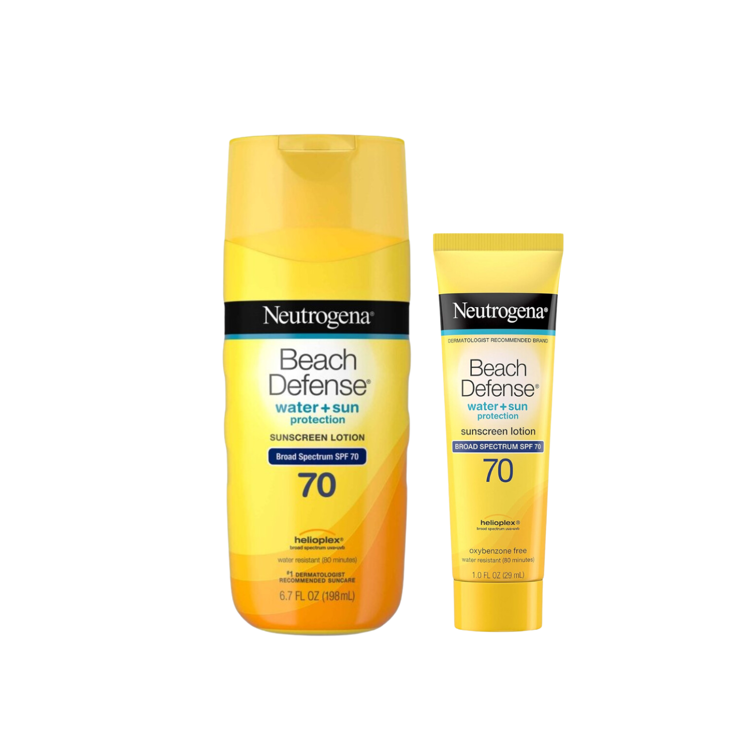☀️6.7-ounce bottle of Neutrogena Beach Defense Water Resistant Sunscreen Lotion with SPF 70 that helps prevent sunburn and decrease the risk of skin cancer and early skin aging caused by the sun when used as directed
