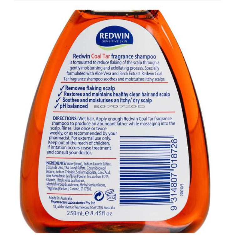 - Specially formulated to reduce flaking of the scalp through a gentle moisturising and exfoliating process. Formulated with Aloe Vera and Birch Extract, Redwin Coal Tar shampoo soothes and moisturises dry and itchy scalps, removes flaking scalp and restores and maintains healthy clean hair and scalp. pH balanced.